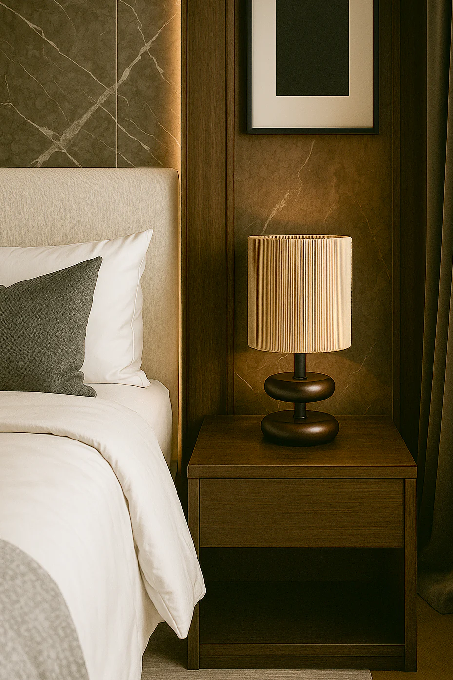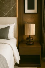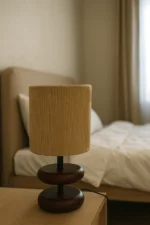 The perfect centerpiece to elevate your living space. Imagine yourself curled up with a book, bathed in the warm, ambient glow of its ribbed lampshade. Feel the smooth, stacked, espresso-toned wood base, with its gentle, rounded curves, as it brings a touch of natural elegance to your bedside table or office desk. This lamp’s mid-century modern design, with its unique and eye-catching silhouette, effortlessly complements any room.