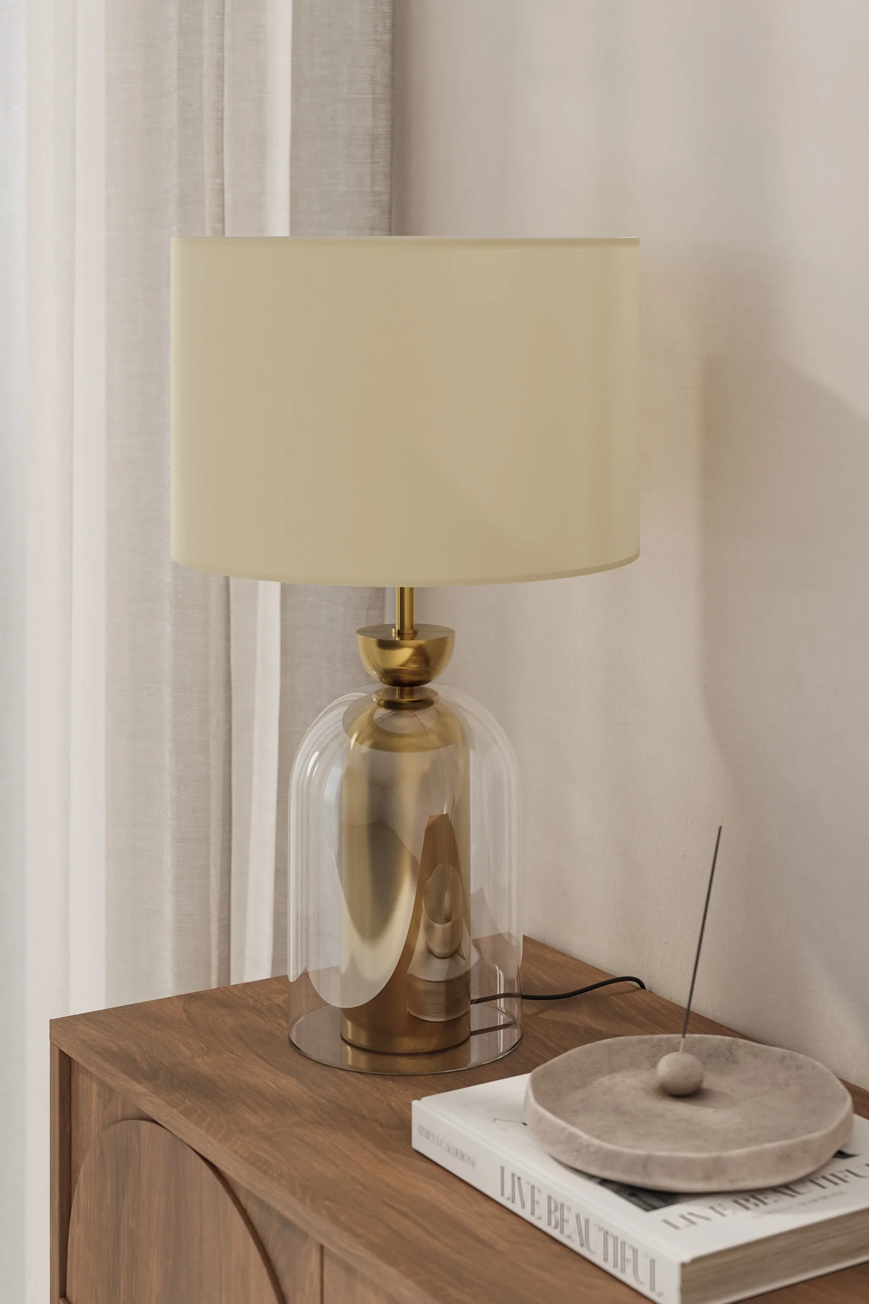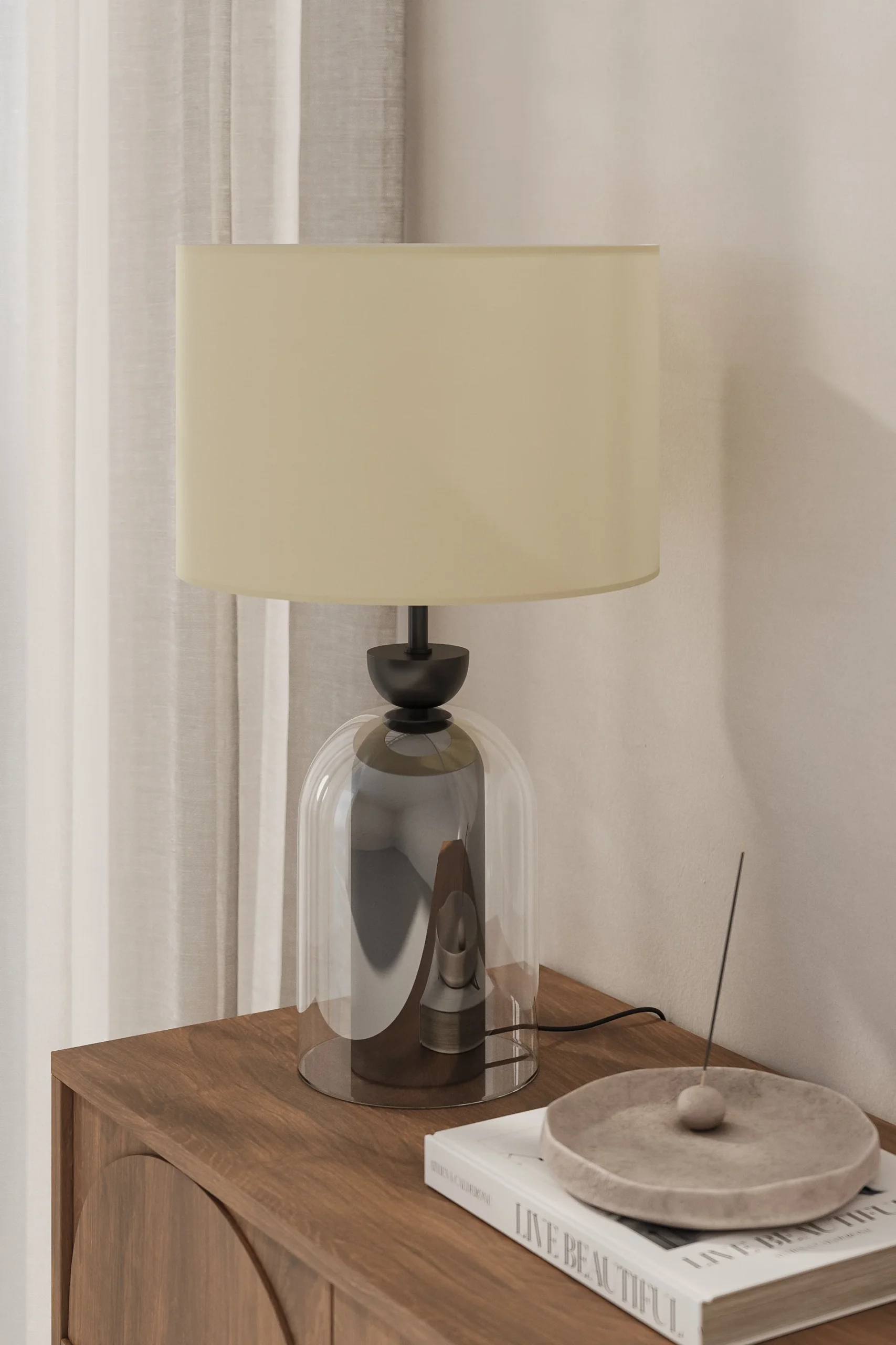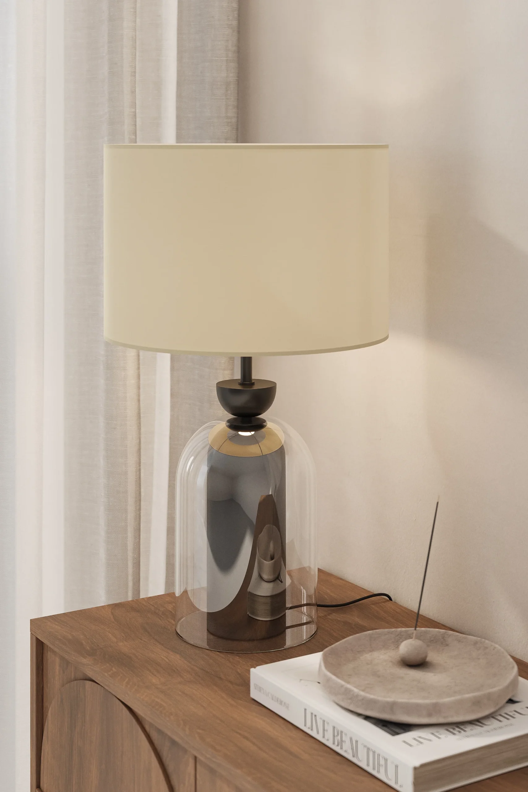 Bathed in a warm glow, this table lamp transforms your space with its sculptural elegance. The glass dome encases a brushed metal core, creating a mesmerizing interplay of transparency and reflection. A linen drum shade diffuses soft, ambient light, adding a cozy yet refined touch to your bedside or console table. Perfect for contemporary and classic interiors alike, this lamp invites a balance of sophistication and warmth into your home.