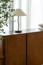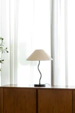 A modern masterpiece blending sculptural design and practical elegance. Featuring a gracefully curved metal frame anchored by a sleek black base, this table lamp makes a striking statement on nightstands, side tables, or consoles. The wide, conical fabric shade softens the light, casting a warm, ambient glow perfect for reading or setting a relaxing mood.
